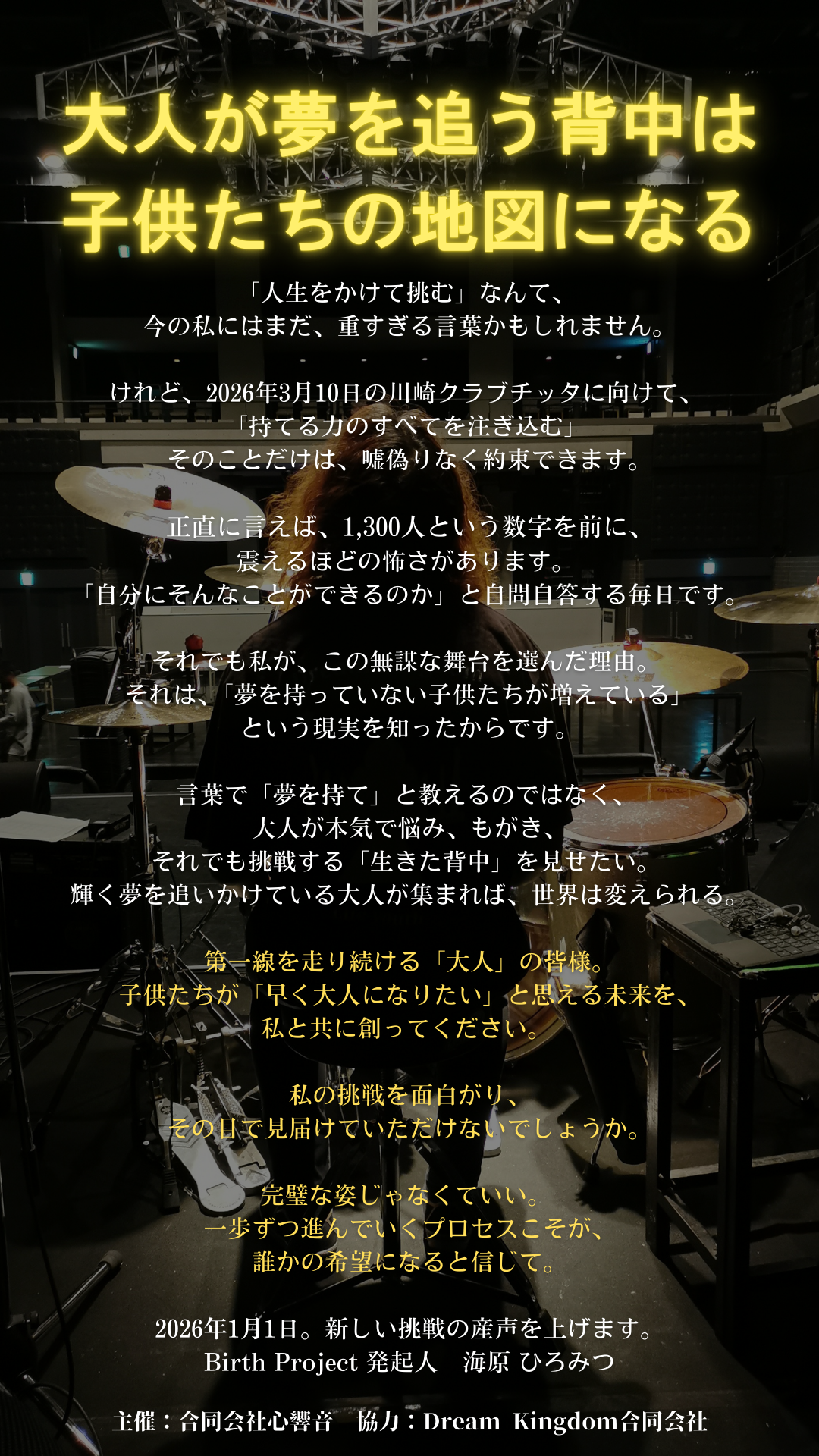 自らの道を切り拓いてきた経営者たち。 情熱を音に託す若きアーティストたち。 彼らが聖地・川崎クラブチッタで、魂を震わせて表現する。 その「非日常の熱狂」こそが、子供たちが明日を一歩踏み出すための「地図」になると確信しています。